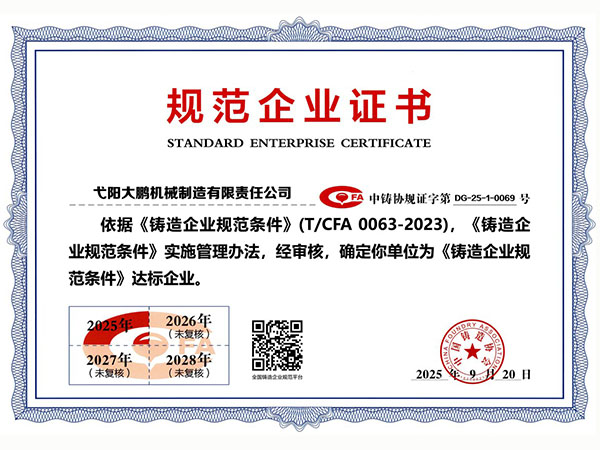 公司顺利通过质量管理体系认证、环境体系认证、职业健康安全管理体系认证、环评。2015年5月获国家工信委颁发的《铸造企业准入条件》;2019年做了安全现状评价;2020年取得了排污许可证。